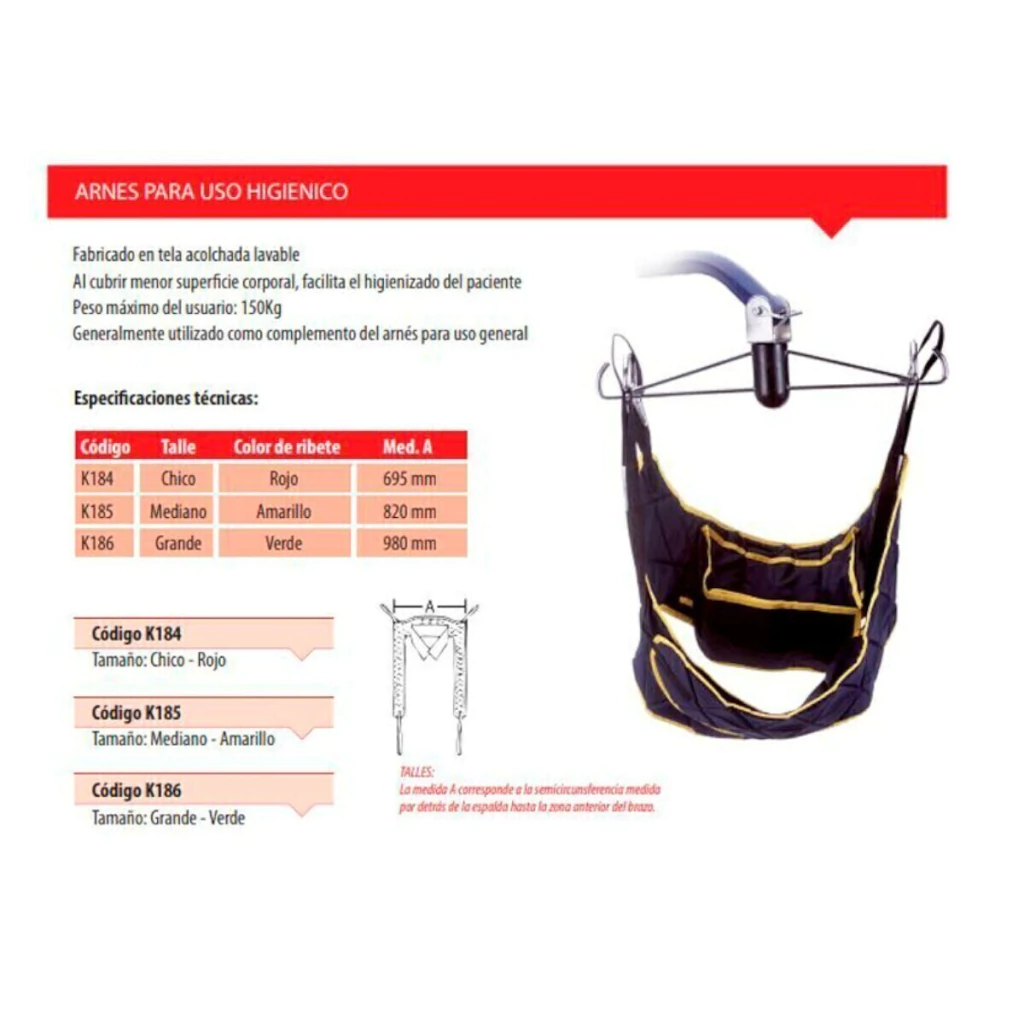 Este arnés de uso específico está diseñado para brindar soporte y seguridad en la movilización de pacientes utilizando levanta pacientes. Fabricado en tela acolchada lavable, es ideal para aquellos que necesitan un arnés cómodo y fácil de limpiar. Su diseño permite cubrir una menor superficie corporal, facilitando el higienizado del paciente.