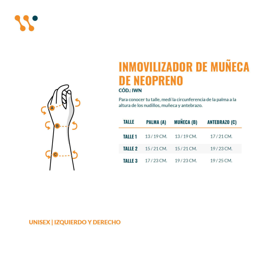 Material de neoprene de 4 milímetros. El grosor es importante, cuanto mayor es, más calor terapéutico brinda. Costuras reforzadas. Sujeción en abrojo. Incluye cinco flejes internos que inmovilizan desde la palma hasta el antebrazo. Productos certificados por ANMAT e ISO9001. La particularidad de este modelo es que abarca la zona palmar y del antebrazo, con la inclusión de cinco flejes internos de inmovilización. El material en neoprene térmico brinda efecto analgésico y terapéutico .