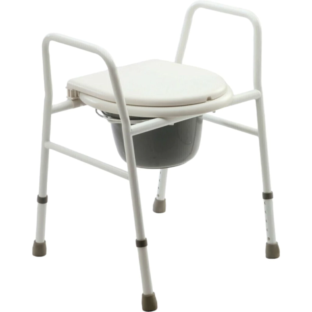 > Inodoro portátil fijo de acero blanco con apoyabrazos.