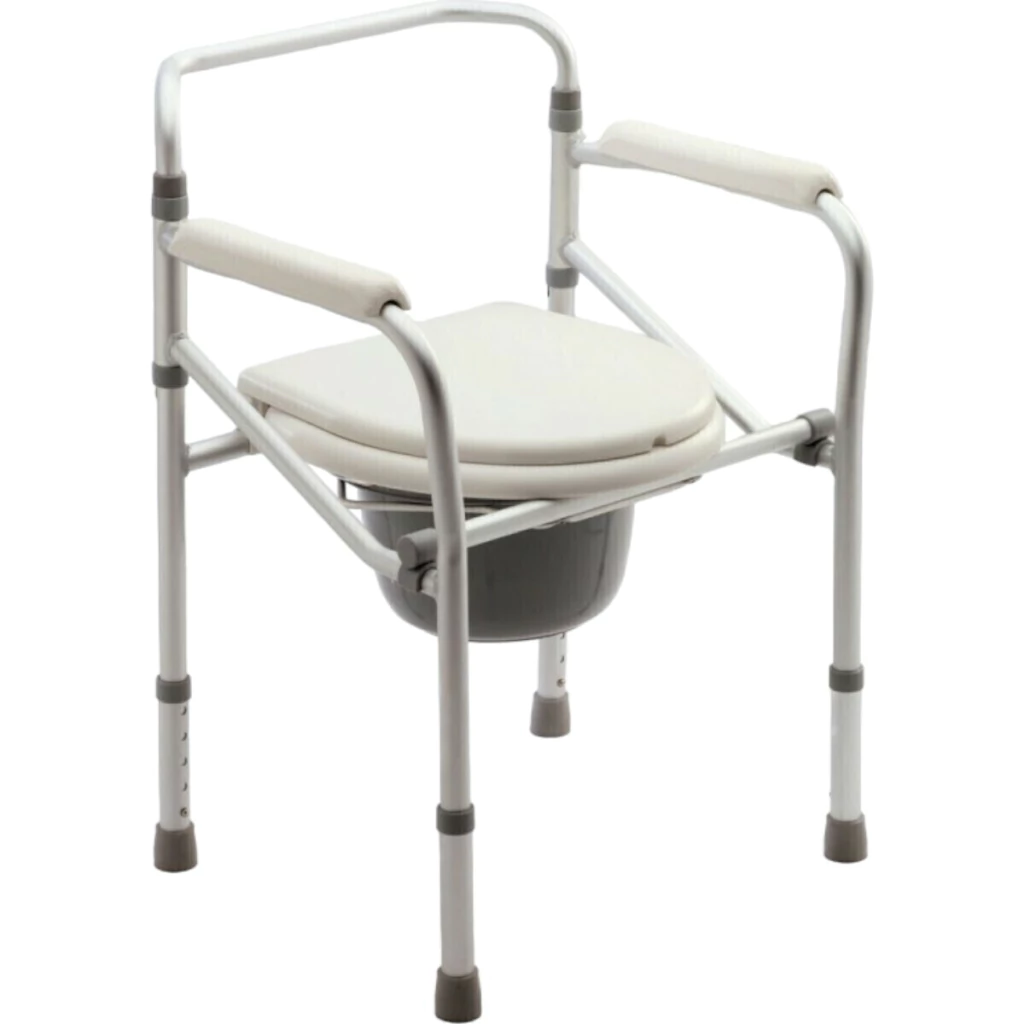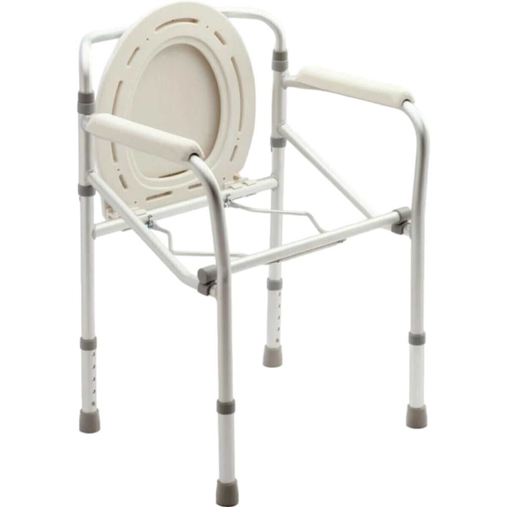 > Inodoro portátil plegable de aluminio con apoyabrazos y respaldo.