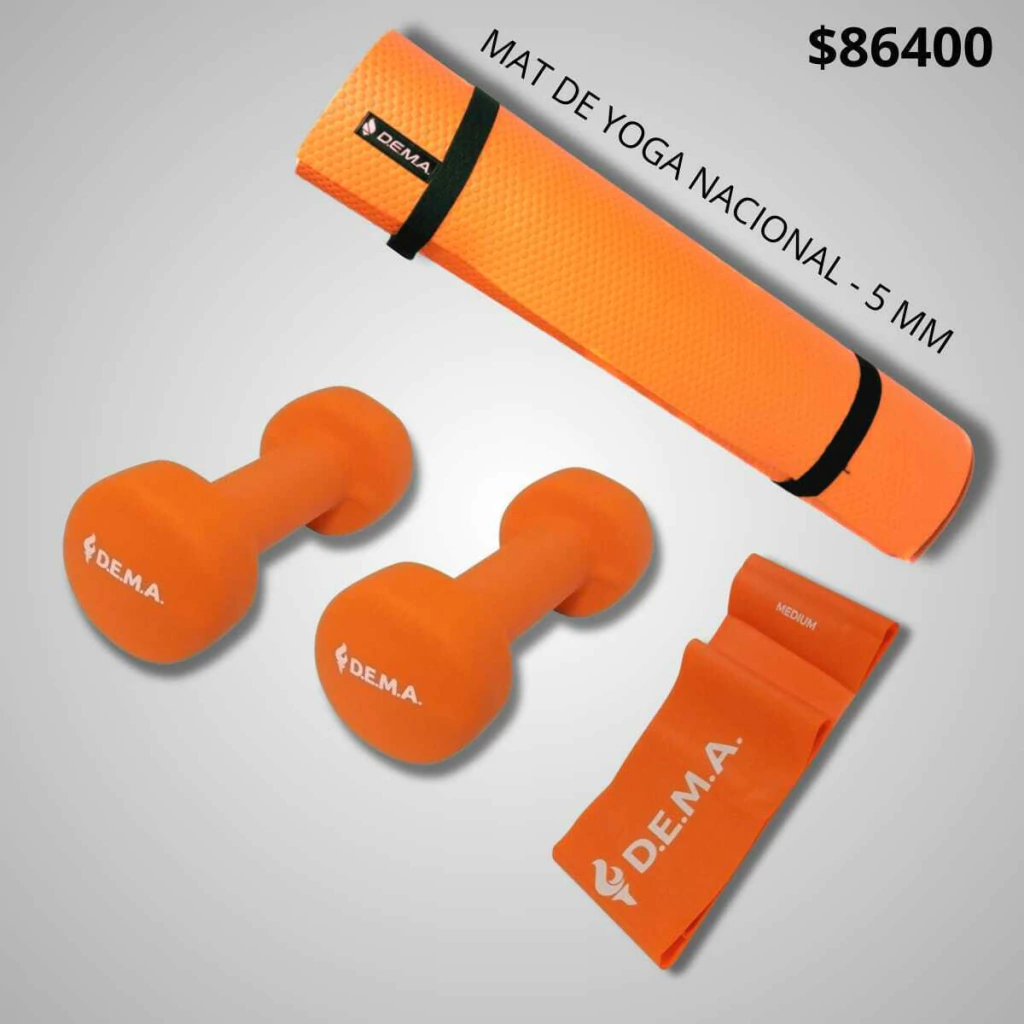 Este completo kit de entrenamiento está diseñado para ayudarte a alcanzar tus objetivos de fitness. Contiene: - 2 pesas de 2 kilos cada una, perfectas para tonificar y fortalecer tus músculos. - Una banda elástica circular medium, ideal para realizar ejercicios de resistencia y mejorar tu flexibilidad. - Un mat de yoga de 5 mm, que proporciona comodidad y estabilidad durante tus rutinas.