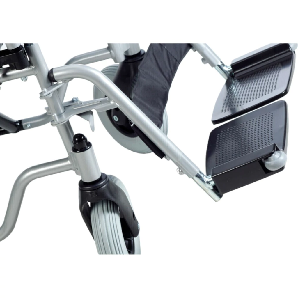 Los apoyabrazos tipo escritorio son desmontables, lo que facilita el acceso a la silla, mientras que los apoyapies son rebatibles y desmontables para mayor comodidad. Con una terminación en pintura epoxi color gris claro, esta silla tiene un aspecto moderno y elegante.