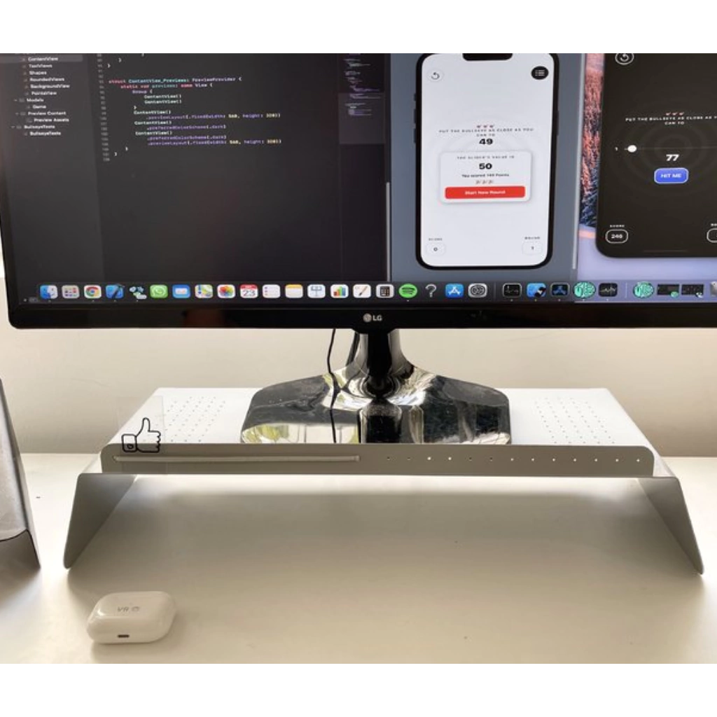 Eleva tu monitor a la altura ideal para mejorar tu postura. Superficie calada para ventilar y espacio de guardado para organizar tu espacio de trabajo. Sobre el frente se encuentra una solapa con elástico para enganchar notas y papeles.